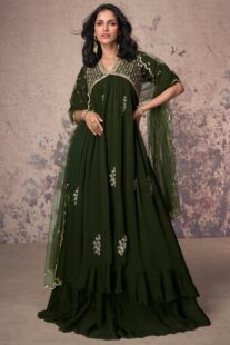 Grace every occasion with timeless elegance in this Fern Green Chinon Silk Embroidered Anarkali Dress with Dupatta from Like A Diva. Designed to exude charm and sophistication, this stunning ensemble is crafted from premium Chinon silk, offering a soft, flowy silhouette that enhances your natural grace. The flared and tiered Anarkali design creates a regal movement, making it a perfect...