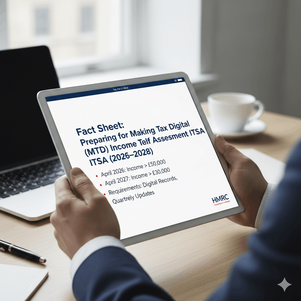 Major changes are coming to the UK tax system. Starting April 2026, Making Tax Digital (MTD) for Income Tax Self Assessment (ITSA) becomes mandatory for many self-employed individuals and landlords. This essential fact sheet breaks down the rollout timeline, eligibility thresholds for 2026 and 2027, and the new requirements for digital record-keeping and quarterly updates. Stay ahead of HMRC’s digital transformation and ensure your business or practice is compliant.